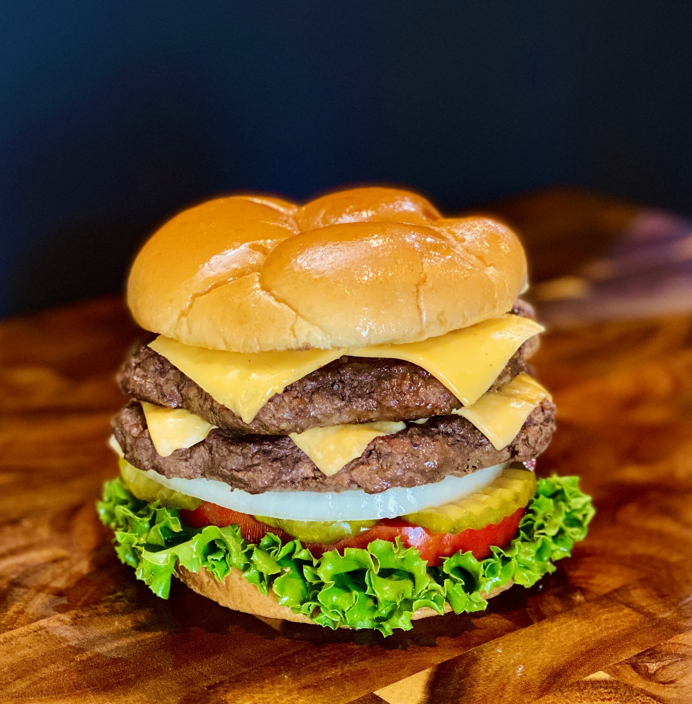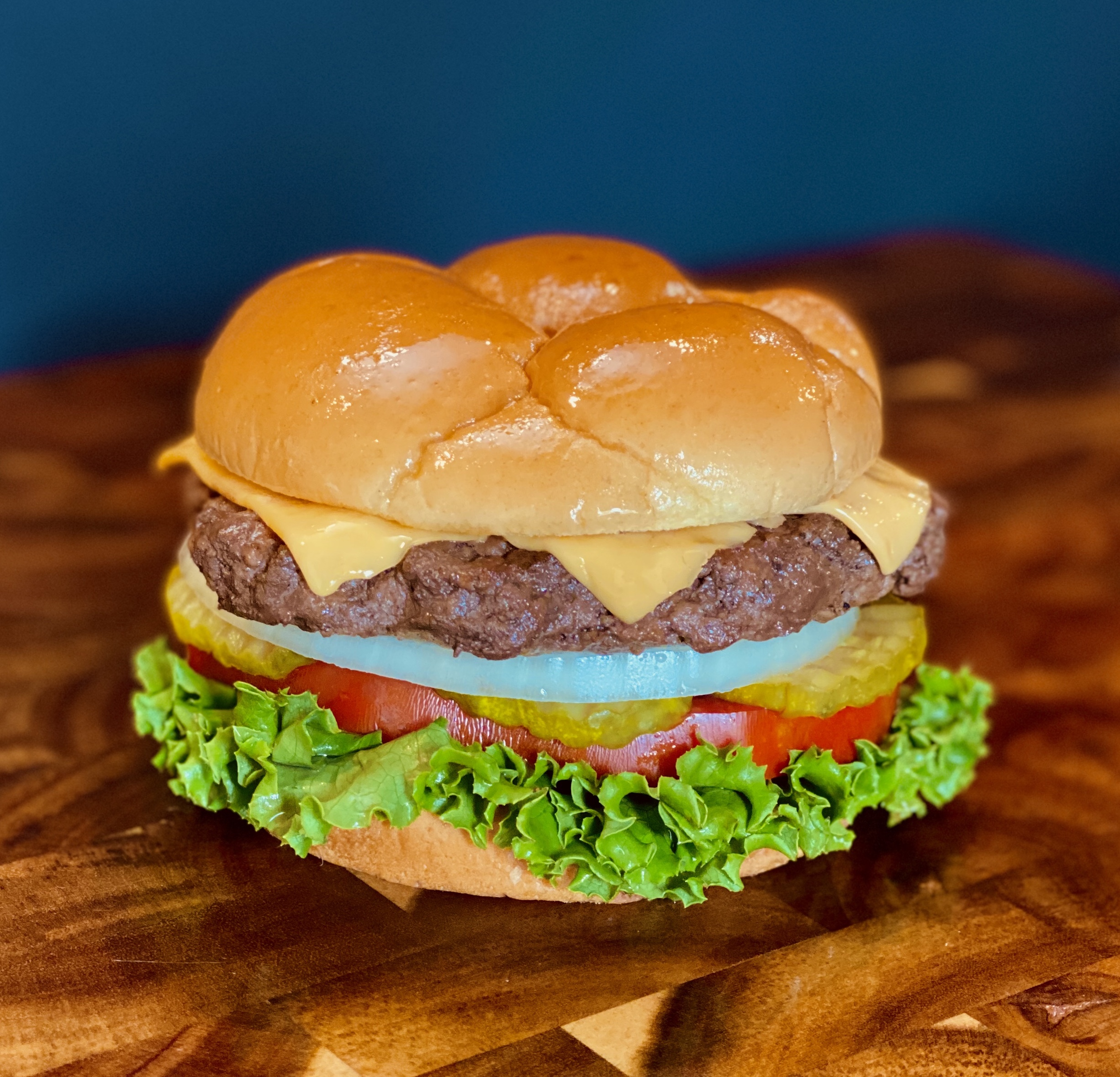 100% Fresh angus ground beef, American cheese, mayo, mustard, onion, pickles, lettuce, tomatoes.