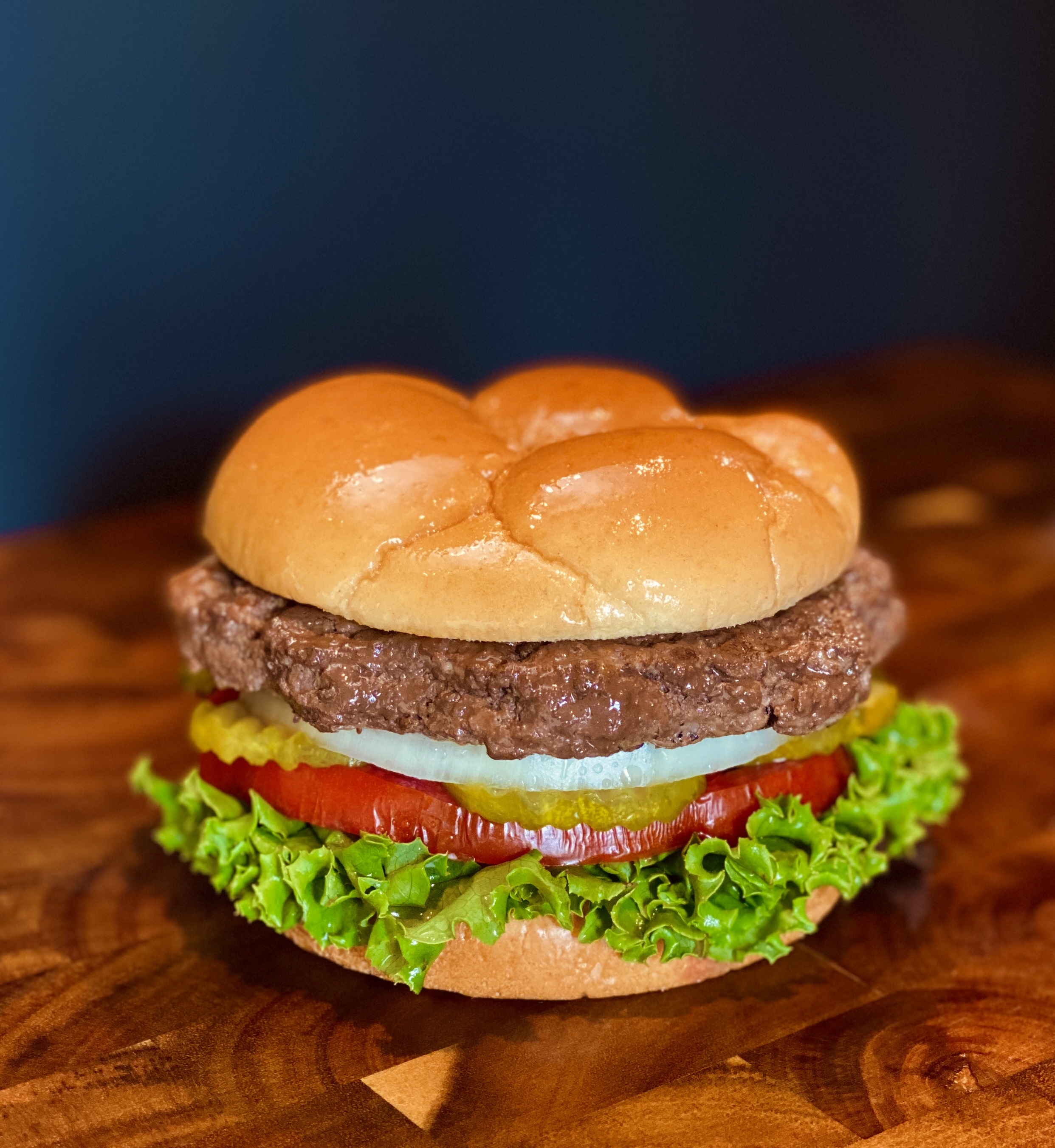 100% Fresh angus ground beef, mayo, mustard, onion, pickles, lettuce, tomatoes.