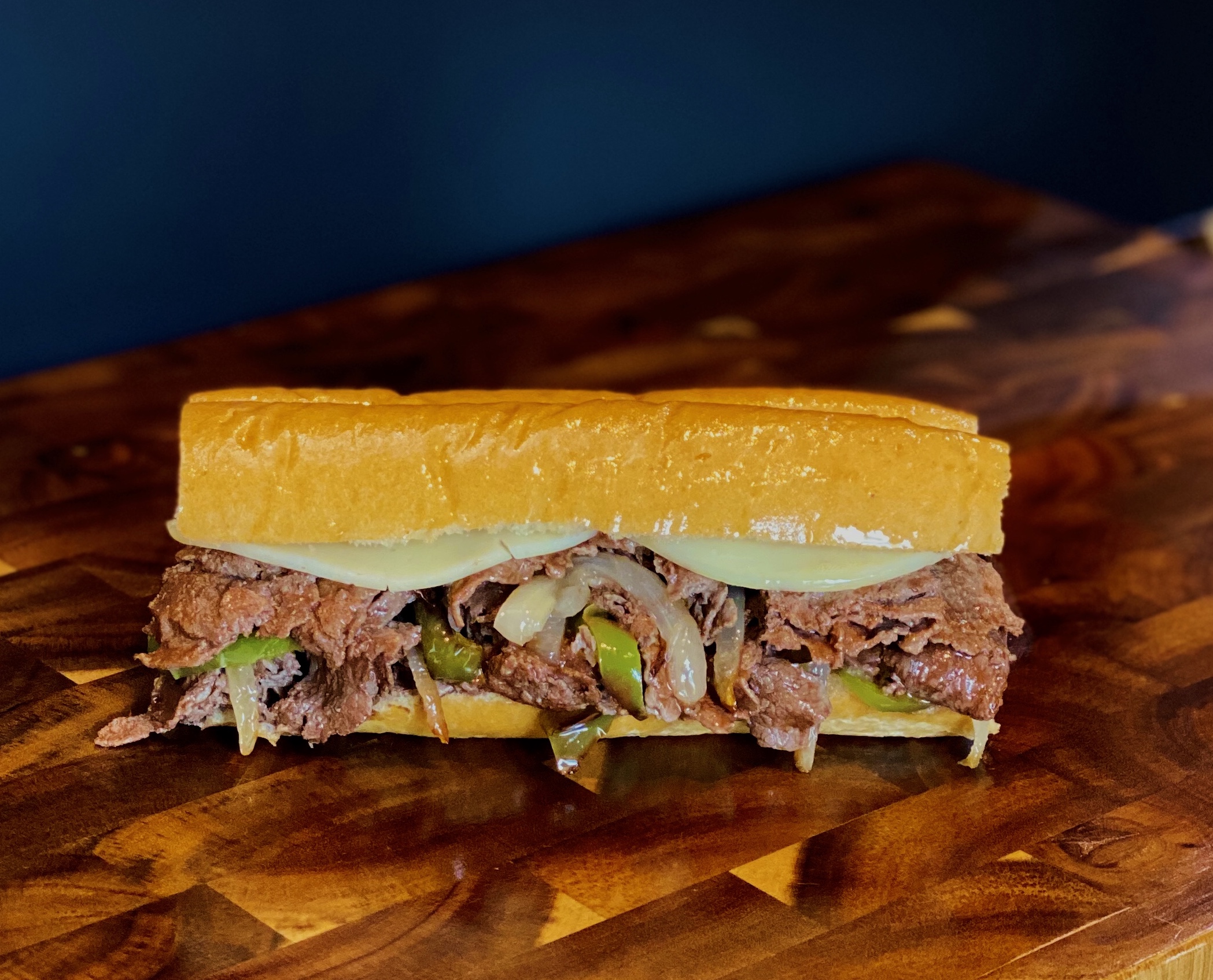 Thinly sliced sirloin beef sautéed with onions and bell pepper. Topped with cheese and mayo spread.