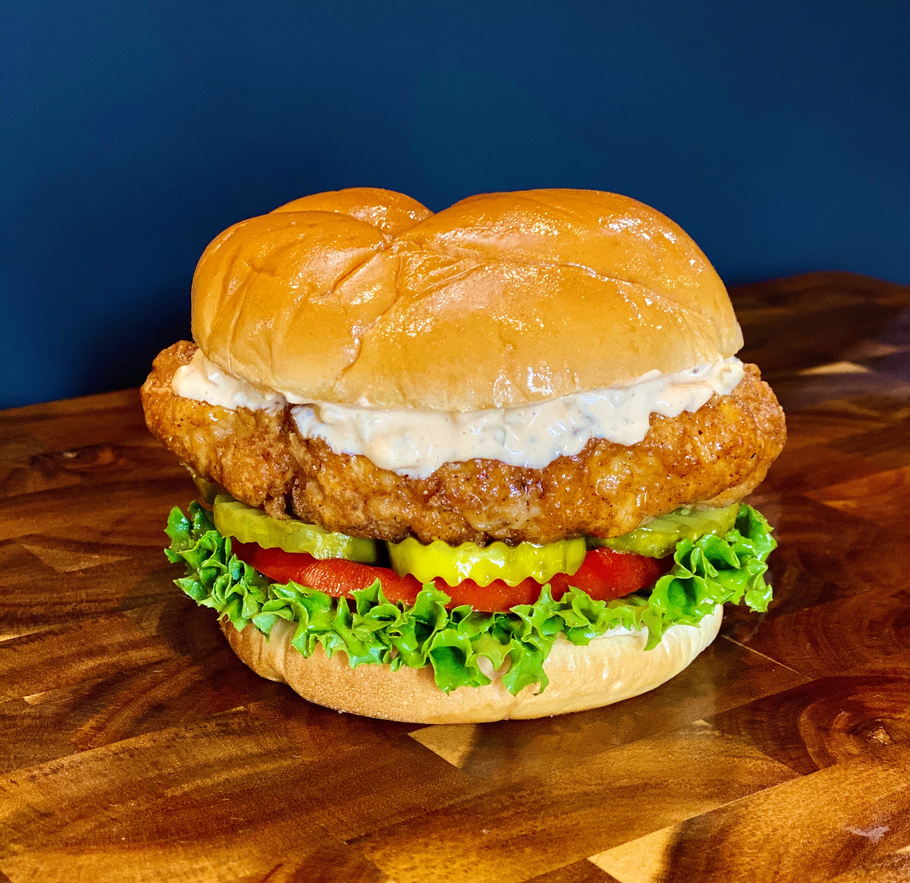 Marinated and fried chicken breast,pickles, lettuce, tomato, topped with our homemade spicy mayo sauce.