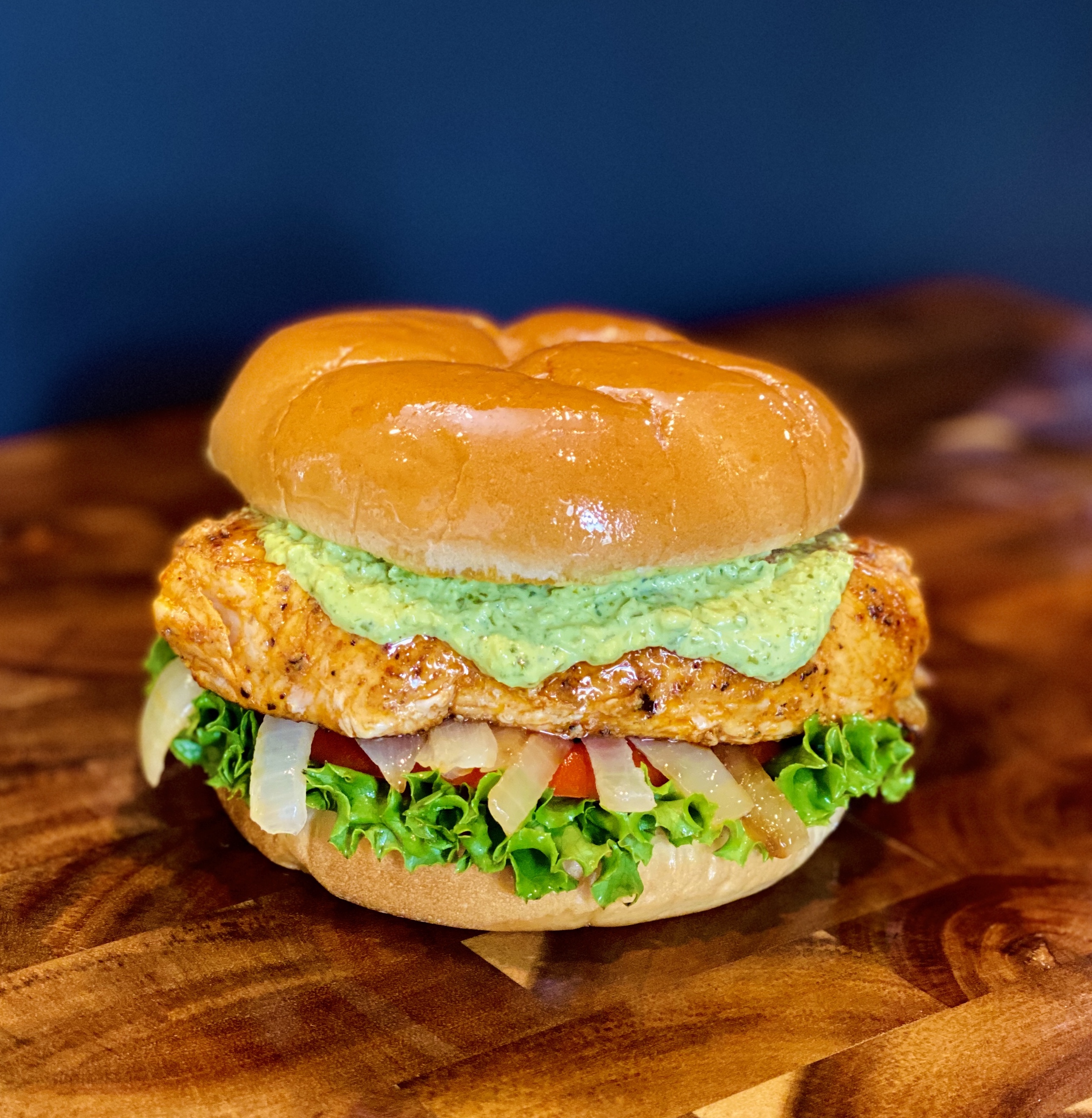 Marinated grilled chicken breast, sauteed onions, lettuce, tomato, topped with our homemade jalapeno cilantro sauce.