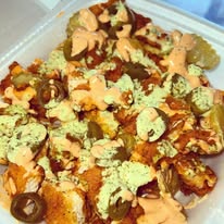Crispy French fries, fried chicken pieces, jalapeno cilantro sauce, spicy mayo, pickles, and jalapenos.