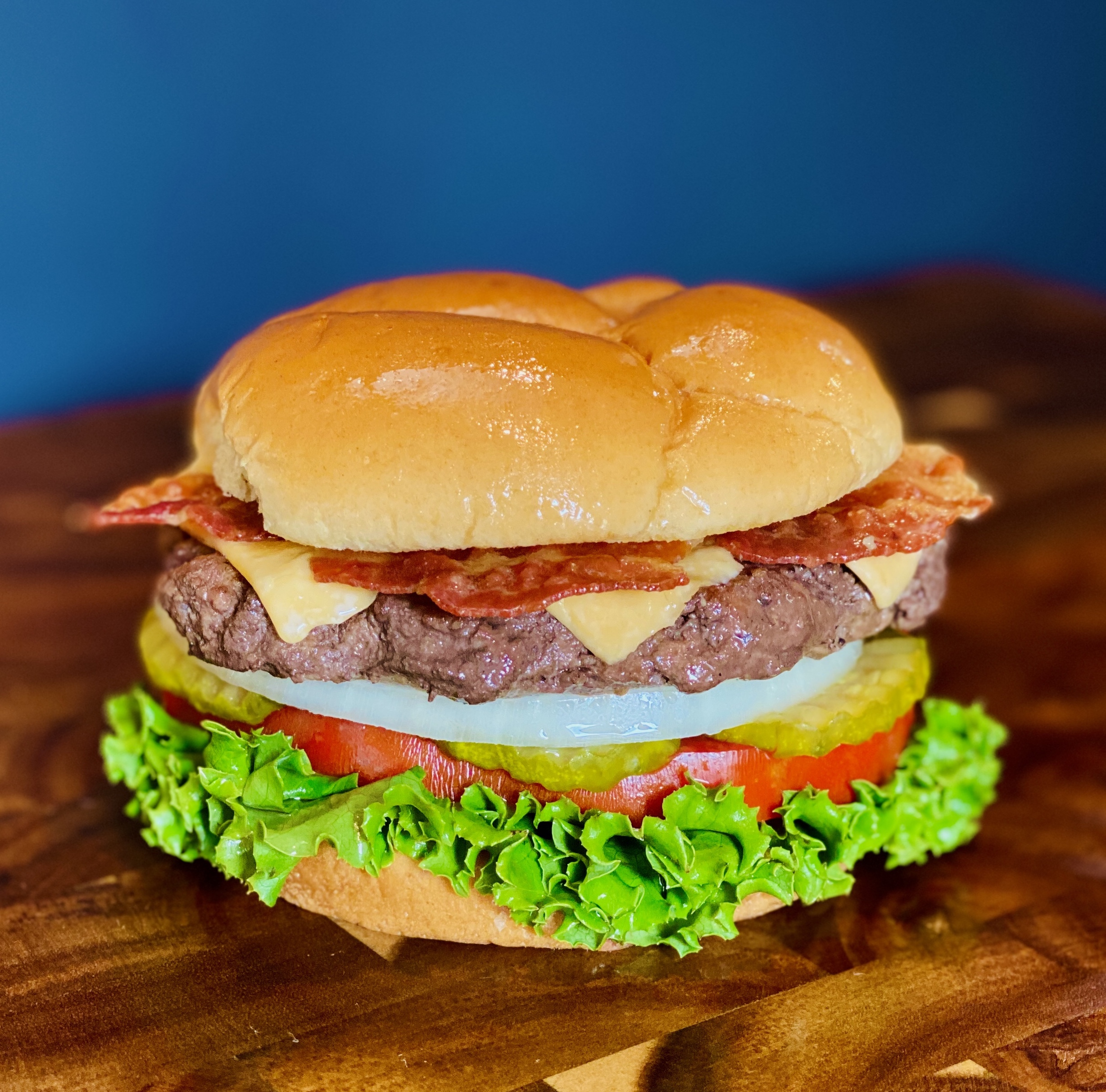 100% Fresh angus ground beef, American cheese, Bacon, mayo, mustard, onion, pickles, lettuce, tomatoes.