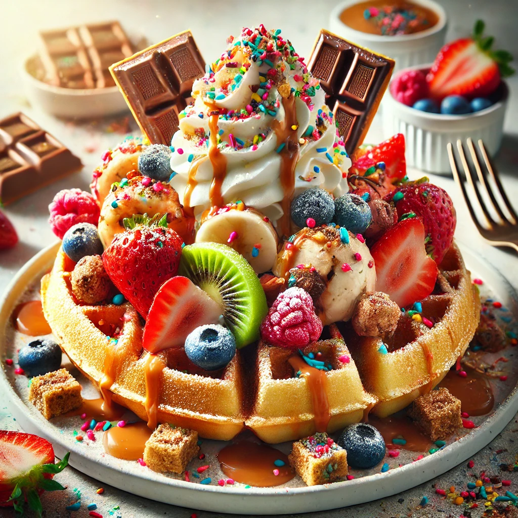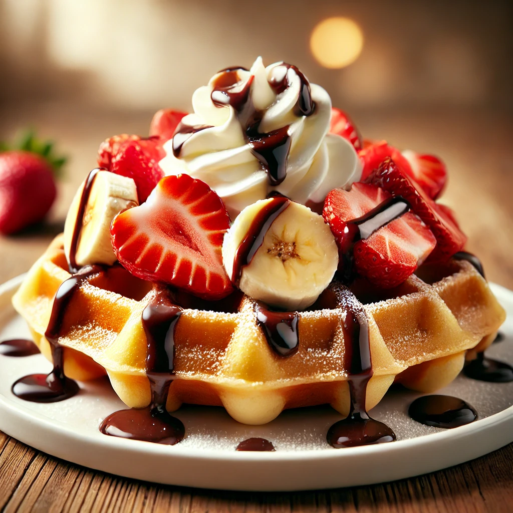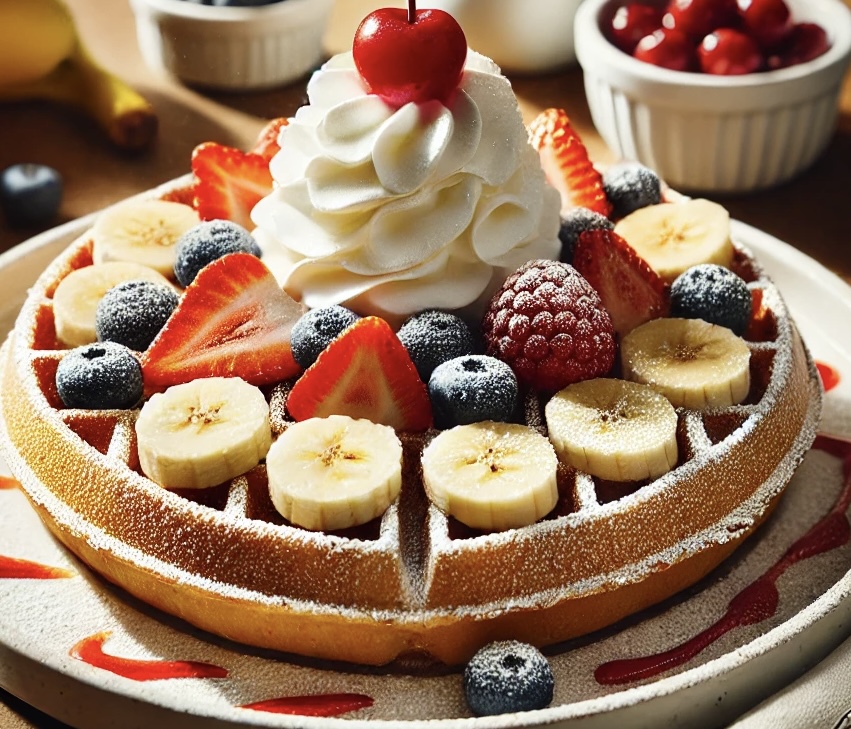 Powdered sugar, sliced banana, sliced strawberries, blueberries, whipped cream, strawberry drizzle, cherry.