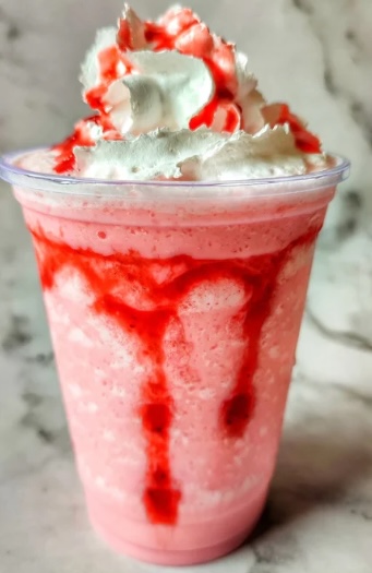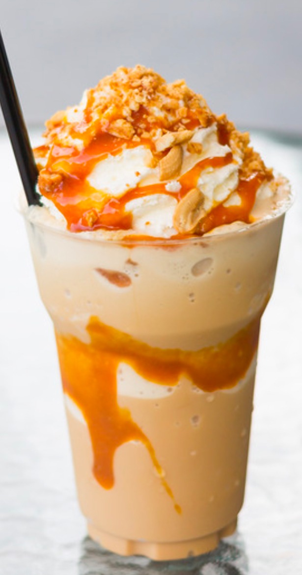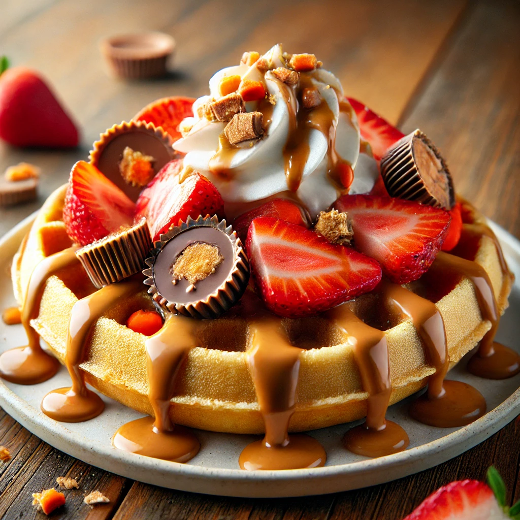 Peanut butter, sliced strawberries, whipped cream, Reese’s cups crumble, caramel drizzle, cherry.