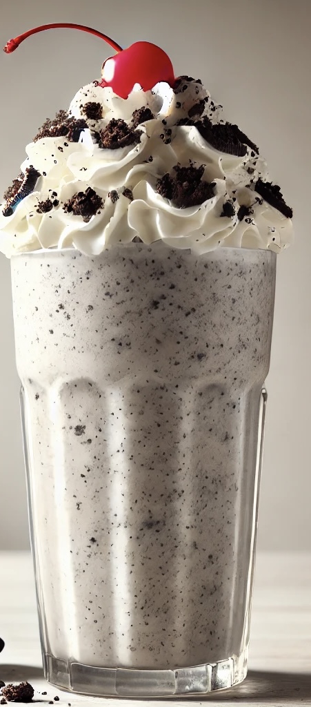 Chocolate ice cream, Oreo cookies, whipped cream, chocolate drizzle, cherry.