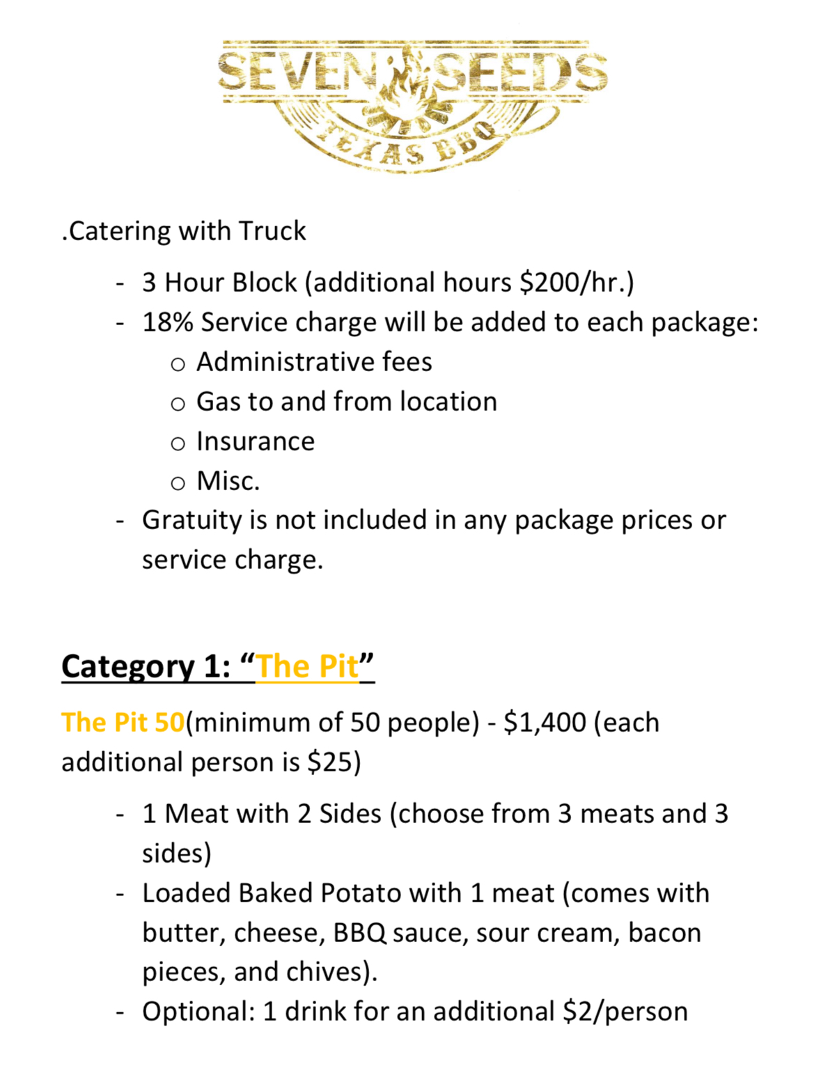 The Pit 200(minimum of 200 people) – 1 Meat with 2 Sides (choose from 3 meats and 3 sides) - Loaded Baked Potato with 1 meat (comes with butter, cheese, BBQ
